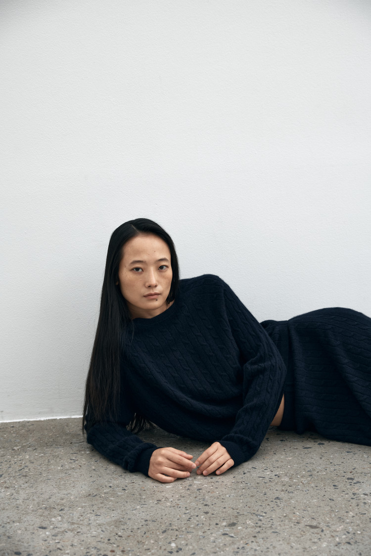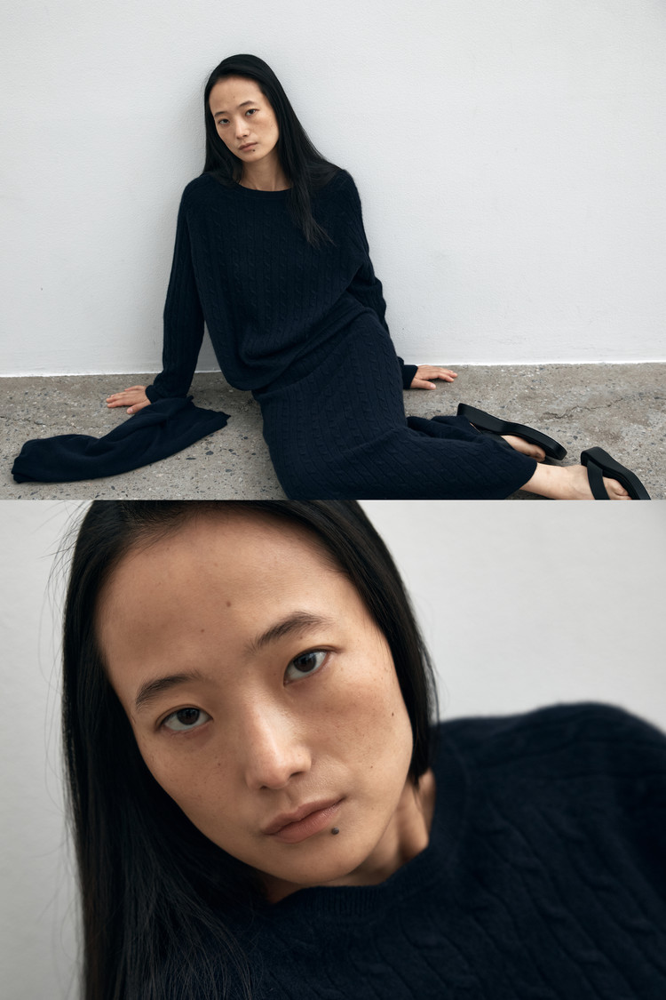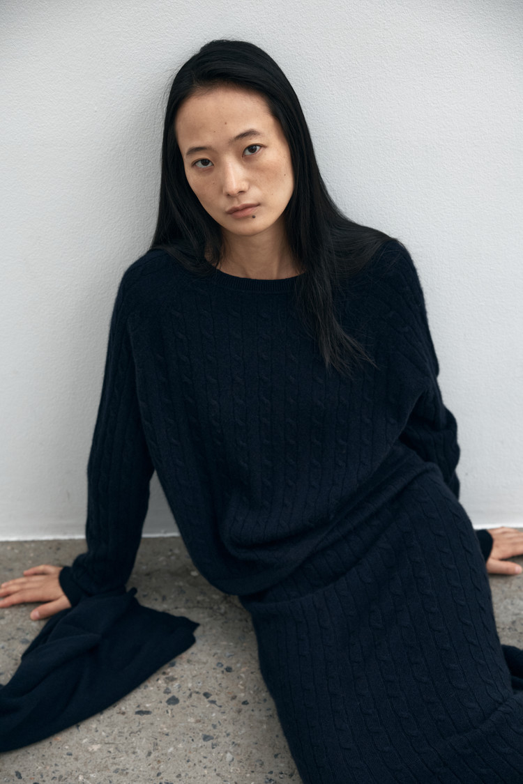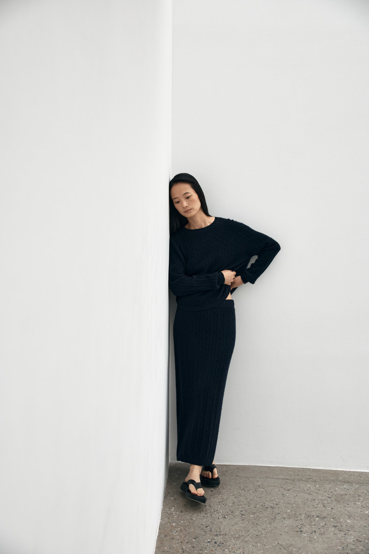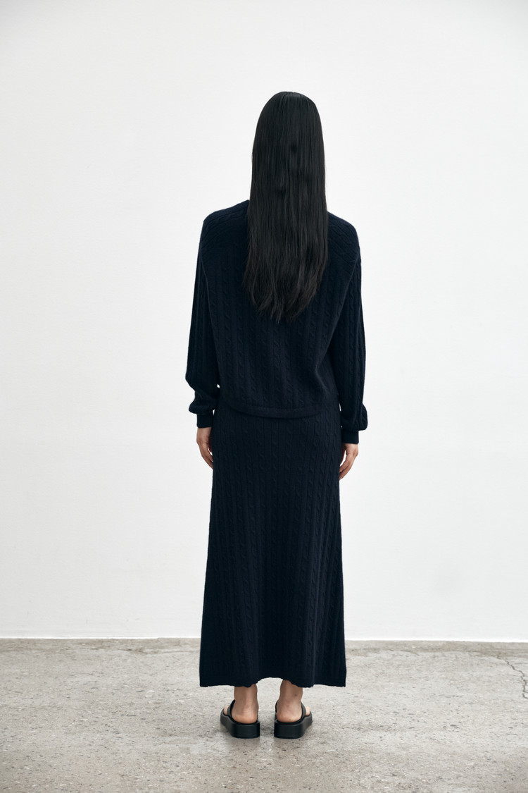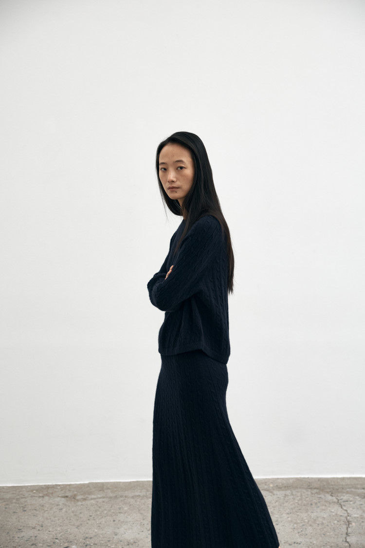 섬세한 케이블 짜임이 눈길을 사로잡는 롱 스커트 입니다. 편안한 착용감과 자연스러운 실루엣으로 허리 한쪽 스트링으로 사이즈 조절이 용이합니다. 니트탑과 같은 소재 및 컬러로 제작하여 벌로도 착용가능하도록 제안하였습니다.