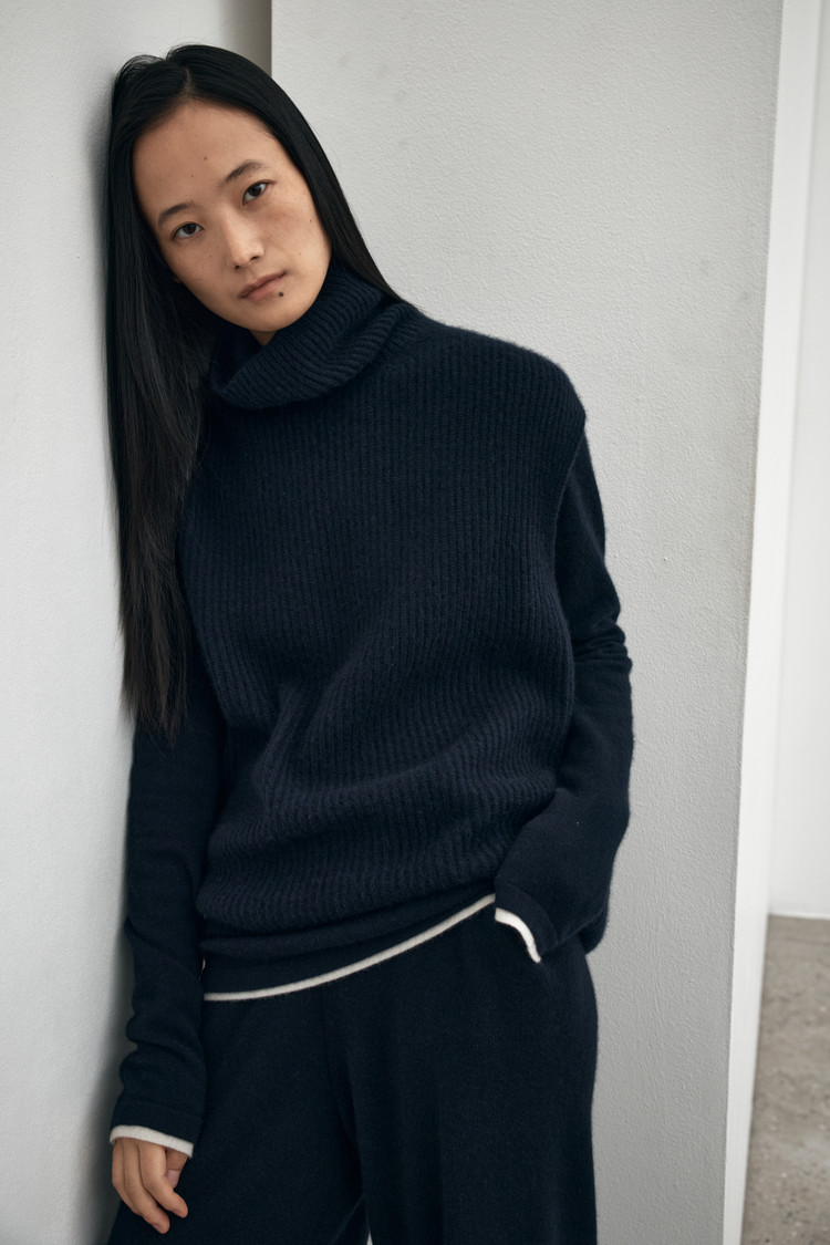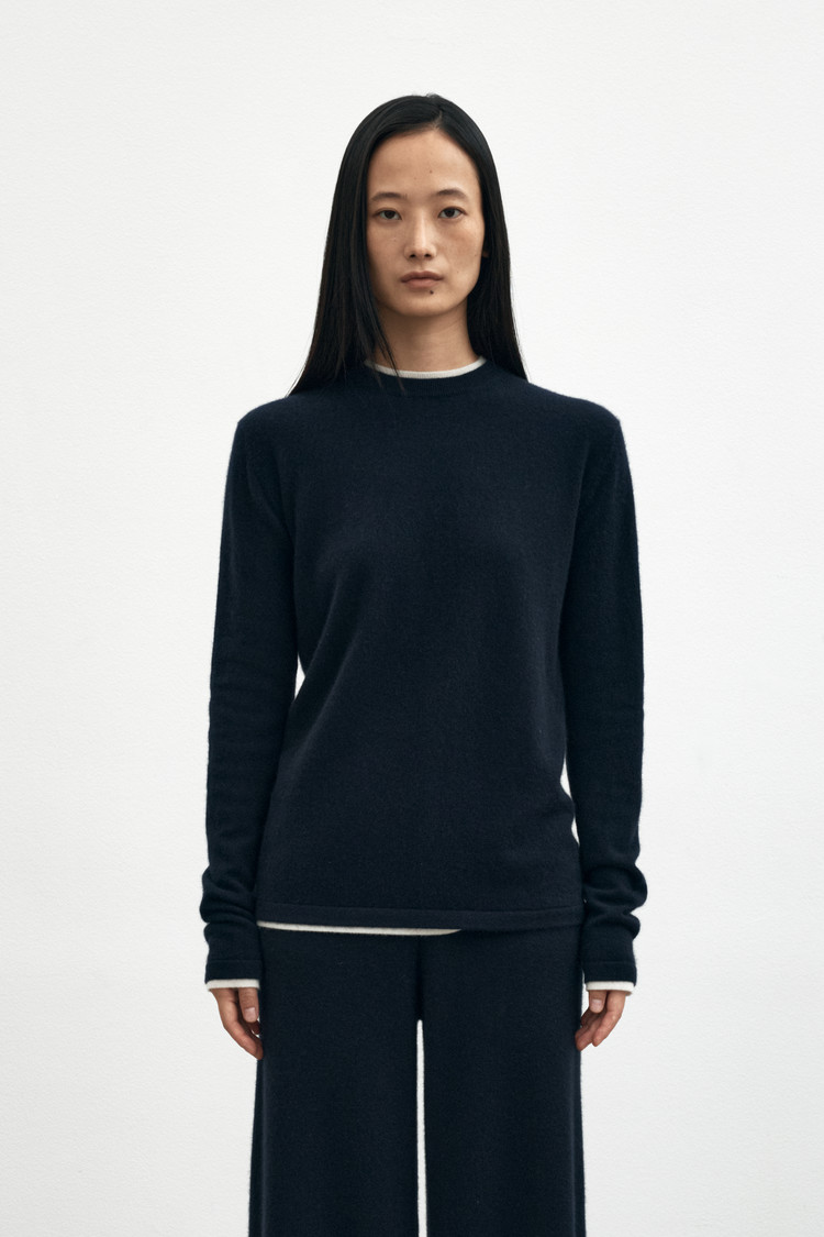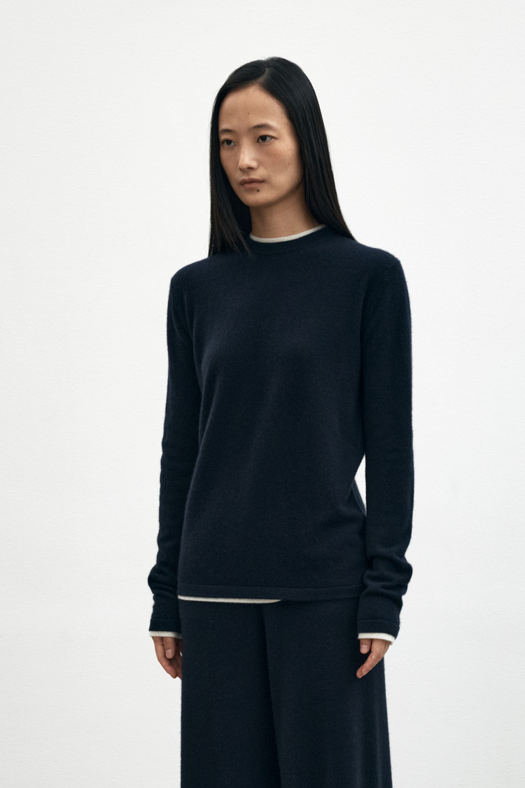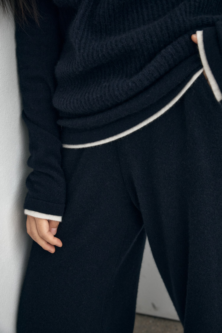 마치 두개의 니트를 겹쳐 입은 듯한 느낌의 풀오버 입니다. 넥라인, 소매단, 밑단 배색 컬러 블록으로 포인트를 주었고 깔끔한 외관으로 데일리 아이템으로 추천합니다.