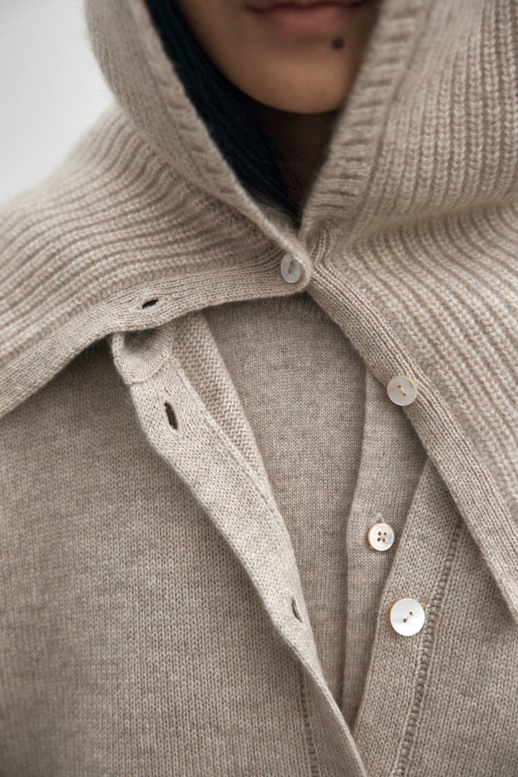 어깨를 감싸주는 스타일과 오버사이즈 후드와 머플러가 합쳐진 디자인으로 보온과 단추 클로징으로 실용성을 높였습니다.